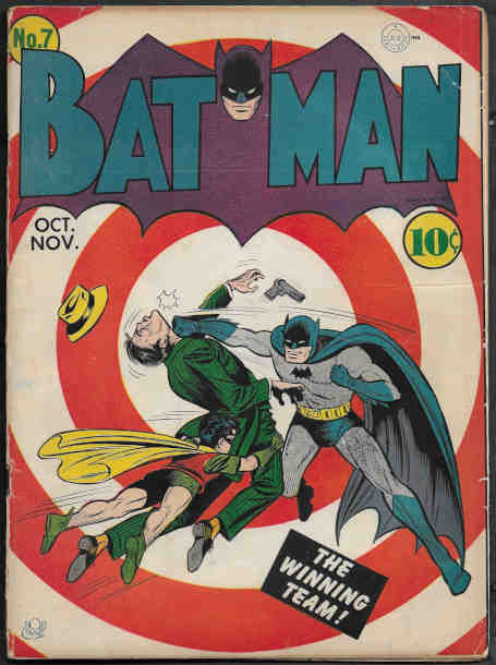 *DC: Welcome to our special Batmania event this week. Star of the show from the Midas Collection is a very decent copy of Batman #7, with its iconic bullseye cover by creator Bob Kane as Batman and Robin overcome a ne’er-do-well. The lead story is a Joker tale by Bill Finger and Kane, with inks by Jerry Robinson, where the Joker recruits practical jokers for one of his nefarious schemes. The same creative team is responsible for all four Batman stories this issue. Plus Batman tackles a hypnotist swami, heads to the North Woods for a lumber operation tale, and Bruce Wayne is set up for murder. A decent, solid copy that presents well. A fresh and unmarked cover image. One small tear without loss by the logo at the right edge with a couple of tiny nicks lower down. Corner blunting with a tiny upper spine split and slightly longer lower spine split; only minor spine wear. The front cover is off the lower staple only and the back cover is off the upper staple only, so the contents are held firmly in place. Both staples are tight at centrefold and the pages are a supple off-white. Slight edge tanning to inside covers. A small triangle is off the back edge top left corner; this is detached but present. All-in-all, a really nice example of this prized issue. High resolution images are available on request.