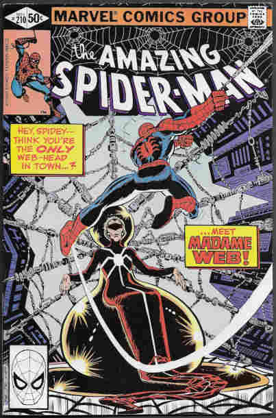#210 VF+ £50 Debut of Madame Web, who was a new type of foe for our hero. An elderly, blind and paralysed woman who happened to be a telepath, both clever and sadistic. A superior copy with great colour, gloss, square corners, near-white pages and firm staples. Just very minor wear at spine and top edge.