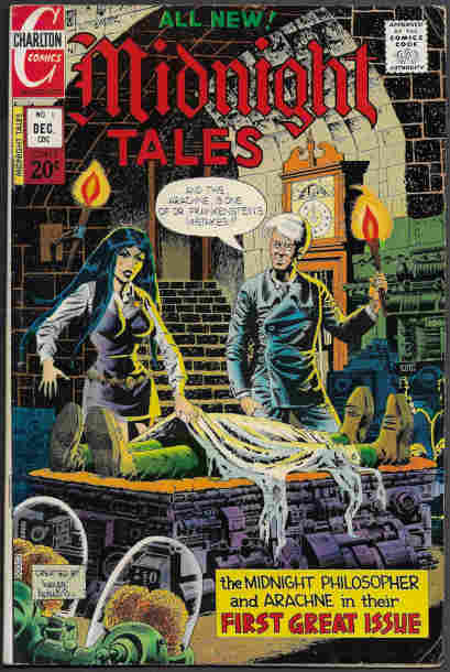 *Horror/Mystery 1960-1980s: Midnight Tales 1972-1976 was a relatively short run Charlton horror series, but one of the best. Created by writer/artist Wayne Howard, whose art was heavily influenced by Wally Wood, the hosts and protagonists were Professor Coffin (aka the Midnight Philosopher) and his attractive niece Arachne, who introduced and took part in every issue, which followed the familiar sequence of framing sections around short stories. We have a complete set of all 18 issues available, averaging FN grade; recommended.