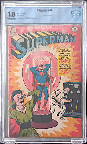 #68 CBCS 1.8 GD- £160 Cover by Win Mortimer. Stories by Edmond Hamilton and Al Schwarz, art by Al Plastino and Wayne Boring. Luthor cover and lead story. This CBCS encapsulated copy is unrestored, case perfect, cream to off-white pages. CBCS Serial number 17244BEBC062. There appears to be water-staining on and around the logo area.
